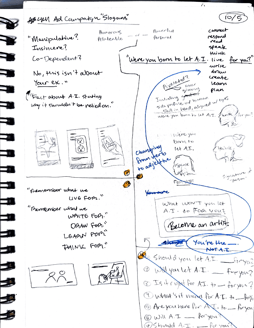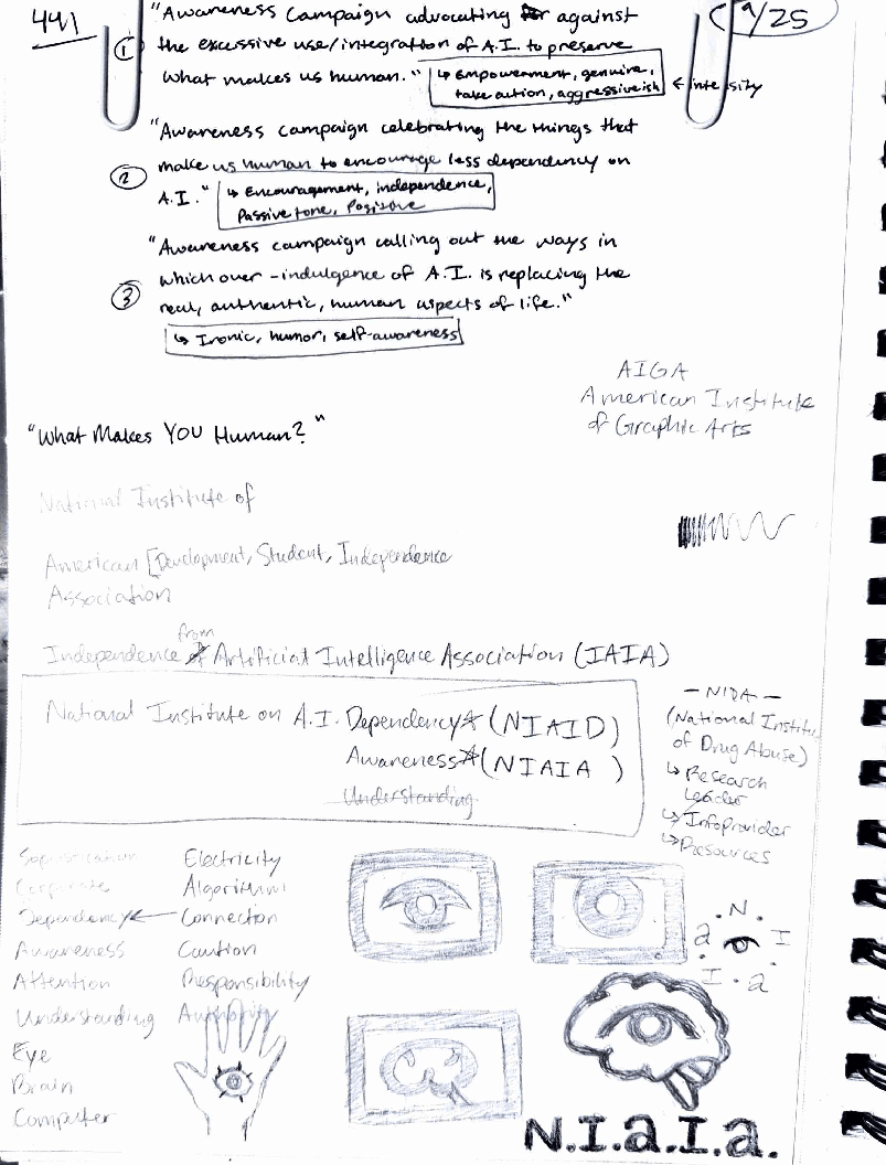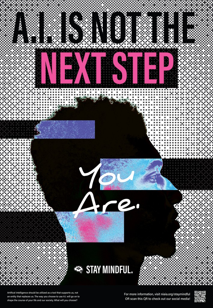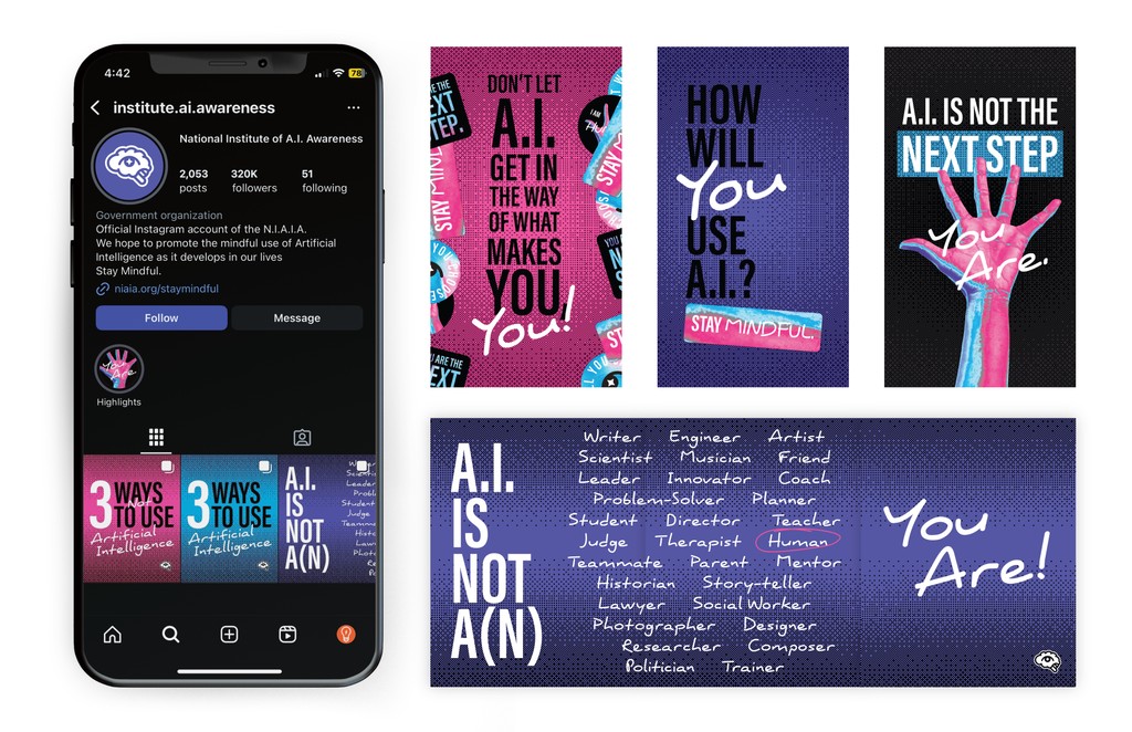 I decided to develop an awareness campaign as a part of the "National Institute of A.I. Awareness" with the goal of highlighting the humanistic qualities in our work and in our lives that artificial intelligence *cannot* express for us. This is not an anti-A.I. campaign, but rather a way to encourage viewers to consider how and how much they utilize artificial intelligence, and to empower people to take back ownership of the qualities that make them human.